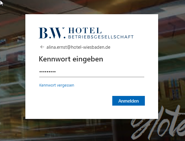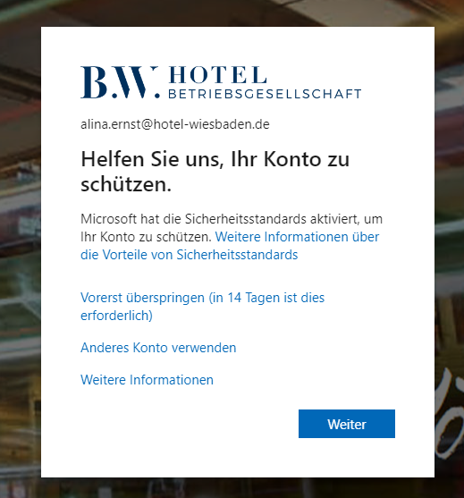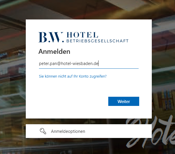 Es erscheint nun eine Anmeldeseite, tragen Sie dort bitte Ihren Anmeldelogin ein (z.B. peter.pan@hotel-wiesbaden.de) und klicken Sie auf Weiter.
